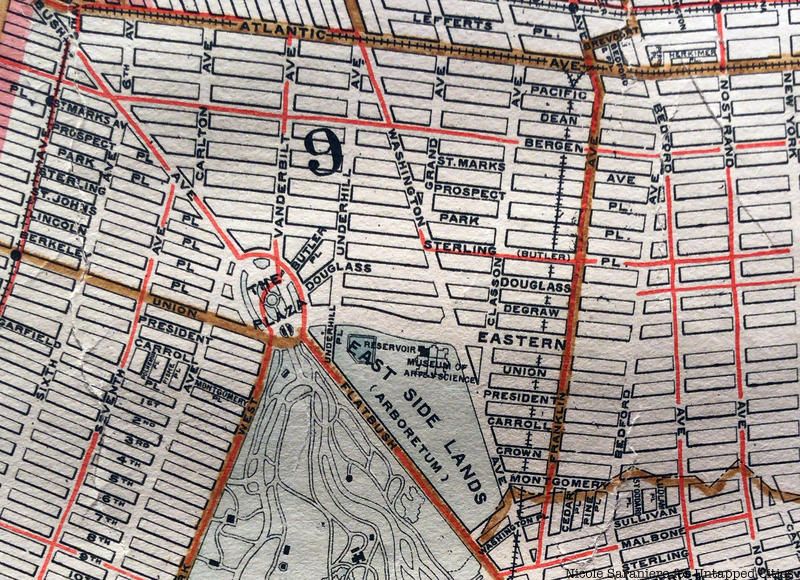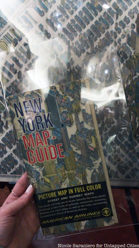 The most recent map of New York City in the gallery is The Age of the Skyscraper, a map from 1963 which was featured inside a brochure for the 1964-1965 World’s Fair. The map was initially hand-drawn by H. Bollmann and was based on 67,000 photographs of Manhattan. The map is slightly distorted, with streets that appear wider than they are in real life, in order to emphasize the scale and height of the city’s skyscrapers. Roy told us that fifty percent of the world’s skyscrapers were contained within Midtown manhattan at the time of the map’s creation. The map was funded by American Airlines and it includes all of the company’s Manhattan ticket offices.