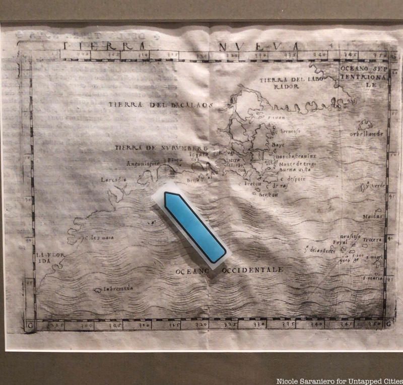 The earliest map in the exhibit, which dates to 1548, is the first map that includes a glimpse of New York Harbor. The map is based on data collected by Giovanni Verrazano on his exploratory trip to the new world and covers the whole east coast of what would become America from as far south as Florida.