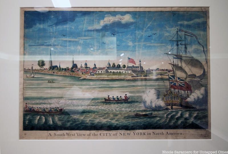 Jumping ahead to the Revolution, Insiders got to see a view of New York City created in 1730, when New York was under English colonial rule. This image likely accompanied a map of the city. You may notice that the flag in the image is an American flag, certainly not the flag that would have originally been printed there in 1730. That means somewhere along the way the British flag was covered up.