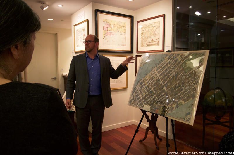 Every month, Untapped Cities Insiders get to go behind-the-scenes at some of New York City’s most unique locations and meet the experts behind them. This week, Insiders got an in-depth look at the latest exhibition of rare and antique maps inside the Martayan Lan Gallery from antique map expert James Roy. The exhibition, New Amsterdam to Metropolis: Historic Maps of New York City, traces the transformation of New York City from a small Dutch colony to a bustling 20th century city full of skyscrapers. Roy walked Insiders through hundreds of years of New York City history through maps created based on information from early European explorers, a fun map of the city’s skyscrapers made for the 1964 World’s Fair, one of the earliest subway maps and more intriguing pieces. Read on to learn more about the gallery and find out how you can join our next Insiders adventure!
