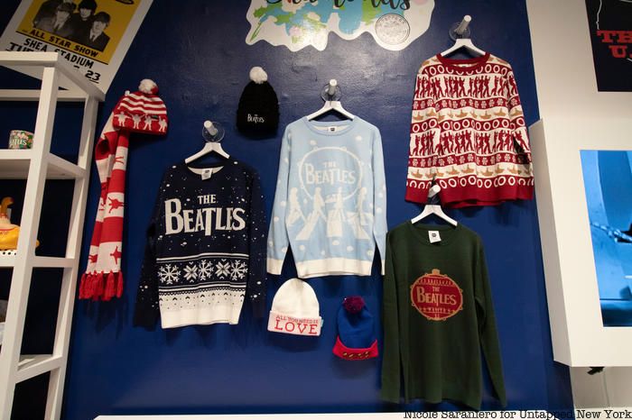 The pop up shop celebrates and showcases the first wave of products available under a newly announced licensing agreement for The Beatles merchandising rights in North America. Inside, you will find everything from Beatles themed socks (arranged in a Christmas tree display of course) to a Yellow Submarine bottle opener. There are also holiday items like Beatles Christmas sweaters, hats, scarves and ornaments. If you are buying a gift, you can have it gift wrapped in Beatles themed wrapping paper.