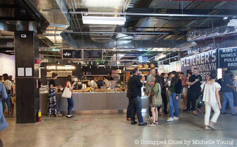 The new DeKalb Market Hall at City Point in Downtown Brooklyn, which has replaced the previous open-air shipping container marketplace that operated starting in 2011, is nothing short of a foodie paradise. Opening this morning at 11 AM, it’s impeccably curated with vendors ranging from Katz’s Deli (with its first outpost out of the Lower East Side) to the Fulton Landing Seafood Company, DeKalb Market Hall clearly puts a spotlight on Brooklyn cuisine with local purveyors like Brooklyn Juicer, Ample Hills Ice Cream (from Gowanus), Bunsmith (from Crown Heights), Steve’s Key Lime Pie (from Red Hook), BK Jani (from Bushwick), Likkle More jerk chicken, and DeKalb Kitchen.