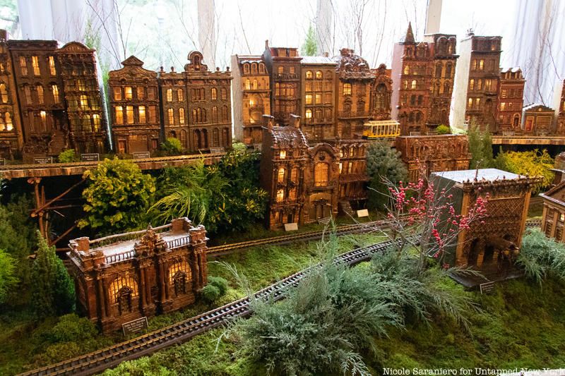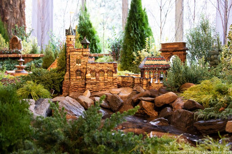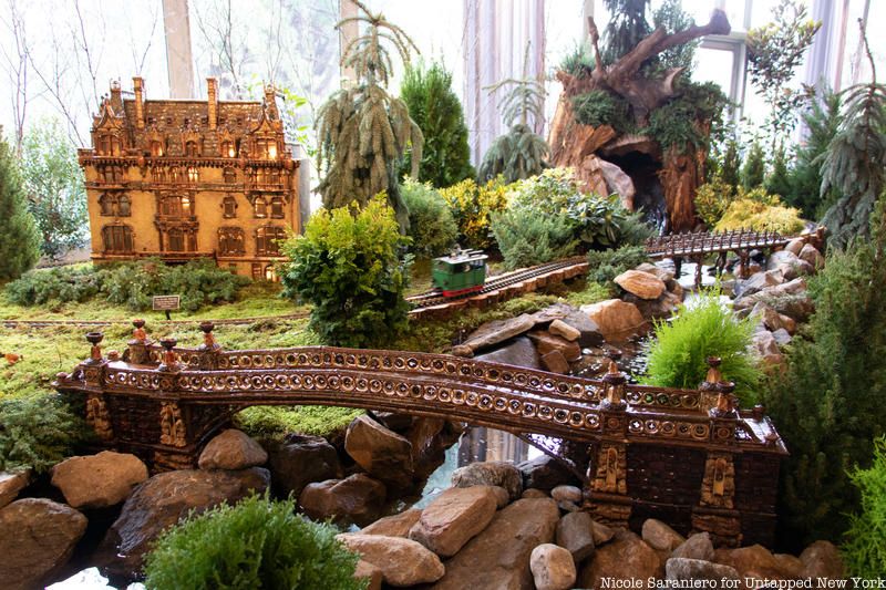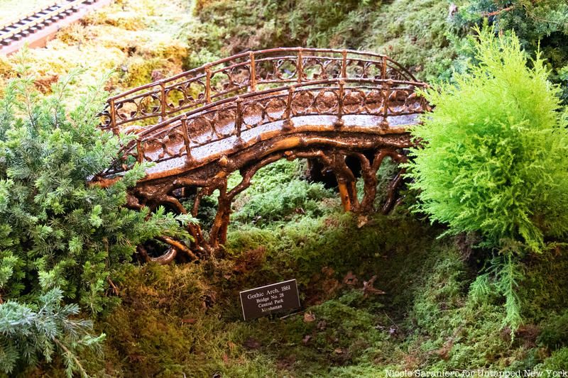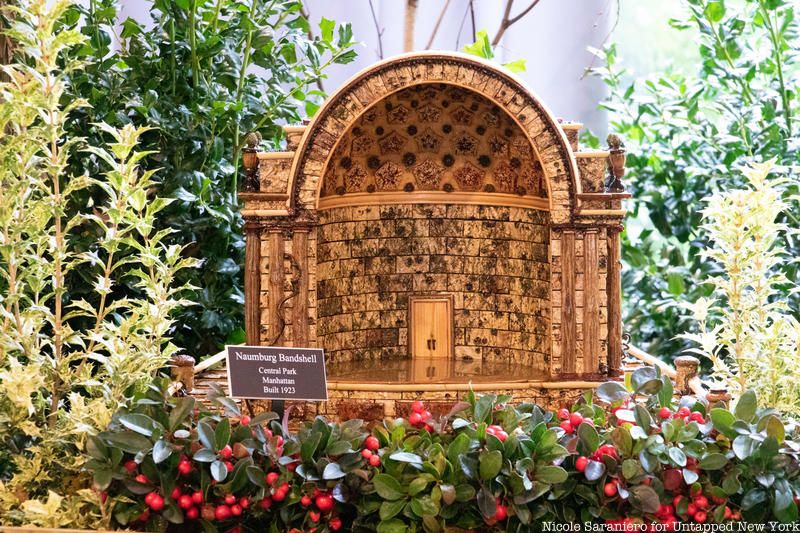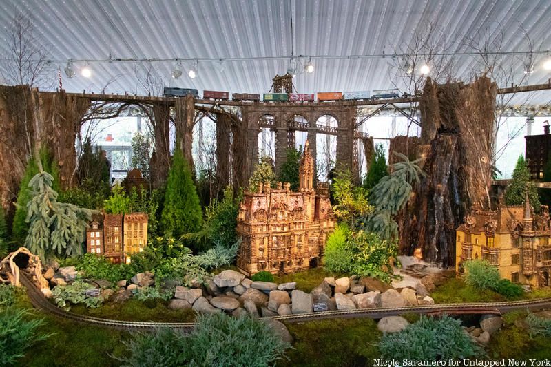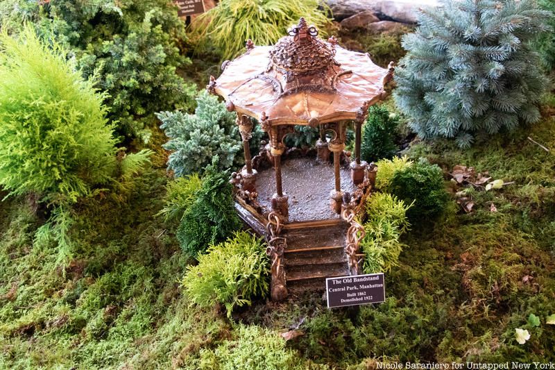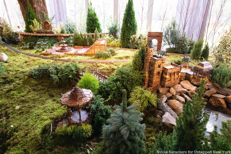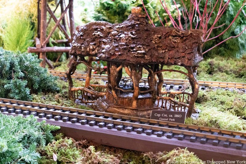 Belvedere Castle, Bethesda Terrace, the Dairy, the Namburg Bandshell, the Bow Bridge and the Oak Bridge make up the fleet of new replicas you will find at the train show this year. They join existing replicas of the Swedish Cottage, Marionette Theater, the Old Bandstand and several Fifth Avenue museums, including the Metropolitan Museum of Art, the Frick Collection, and the Guggenheim, to create a tableau of the Central Park area of Manhattan. The fairytale-like nature of the structures, originally designed by Frederick Law Olmsted and Calvert Vaux, are recreated using twisted branches, pieces of acorns, chestnut bark and more natural materials. A gourd was used to create the curved top of the bandshell.