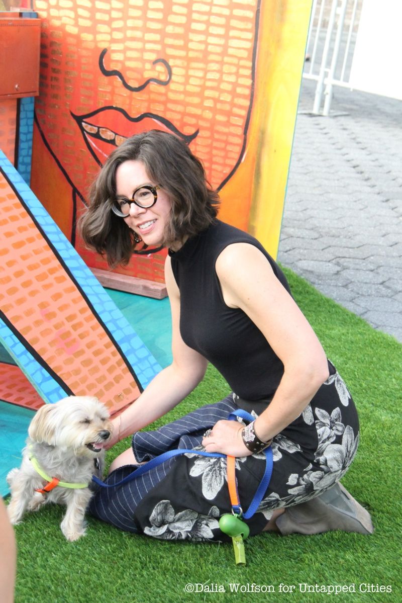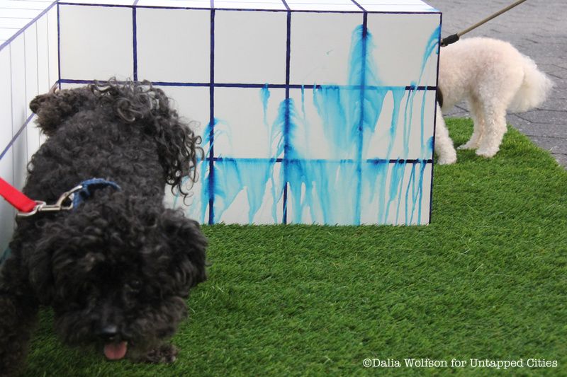 In her essay for Criterion, Dawson wrote that doggie creativity can break up the narrow, stale ways of the art world with a “singular capacity to remain in the moment and to see each artwork with fresh eyes.” Dawson says that it’s a project both sincere and self-aware, and is confident that “some people get it right away and see the multiple levels: humor and satirical quality, but also how it’s heartfelt, how I earnestly believe in it.” The final result of Dawson’s vision is a dog-friendly space that trades white Chelsea gallery walls for the downtown waterfront. Half dog park, half public art, the exhibit consists of ten pieces, most of them mounted on platforms of synthetic grass.