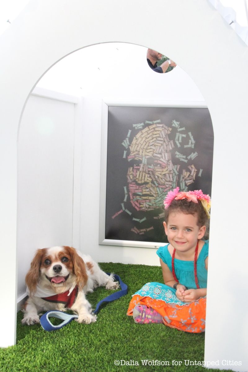 Other pieces present an opportunity for quadrupeds to become part of the installation itself. Two poodles (one medium, one extra-large) who went by Charlie and Sawyer settled themselves gracefully upon Graham Caldwell’s pink sofas. Dog and human posed for pictures inside a doghouse with an edible portrait, Noah Scalin’s The Hand That Feeds.