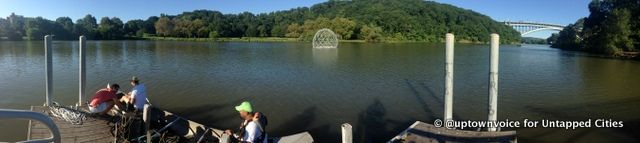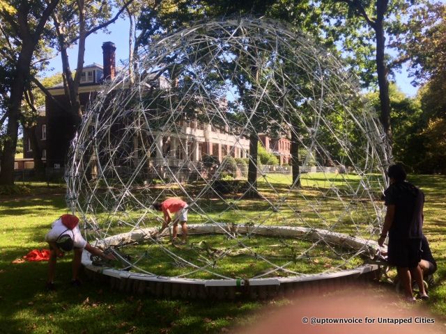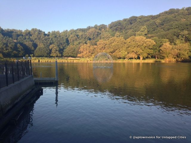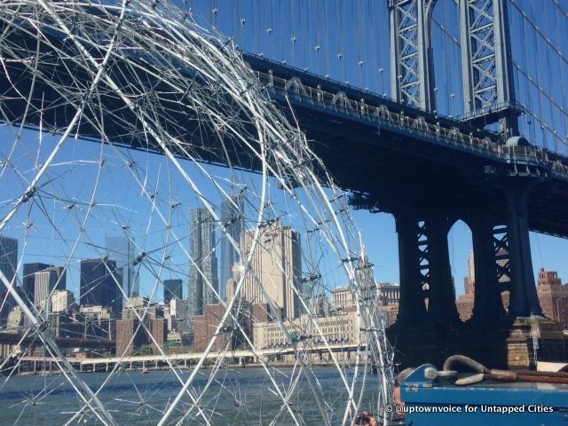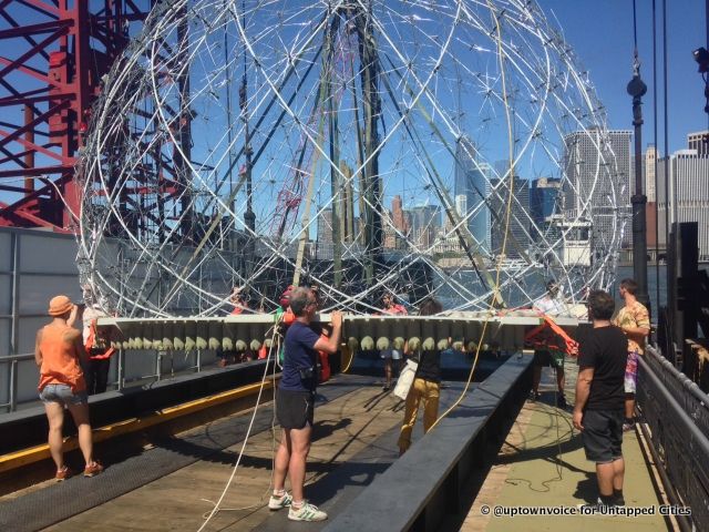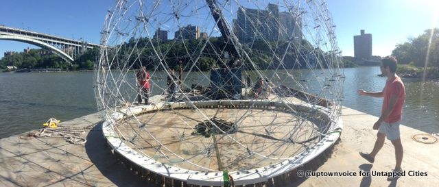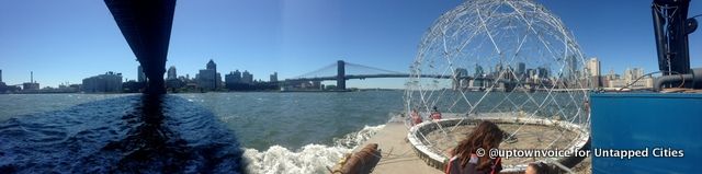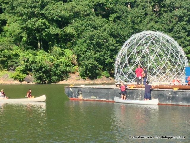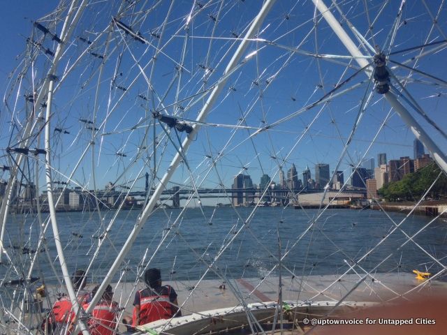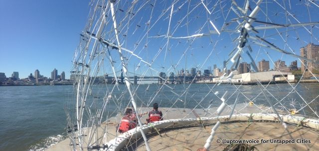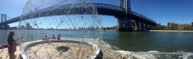 The Harvest Dome, a floating installation of 500 broken umbrellas and empty soda bottles, by SLO Architecture, moved from Inwood to Governors Island this morning in preparation for the art fair. We were invited by SLO Architecture to track its movements by barge (as we did on its initial launch from the Brooklyn Navy Yard to Inwood). According to Curbed, it’s got a selling price at the art fair for $20,000! Here’s the play by play of today’s movements in photos, accompanied by smashingly great weather.