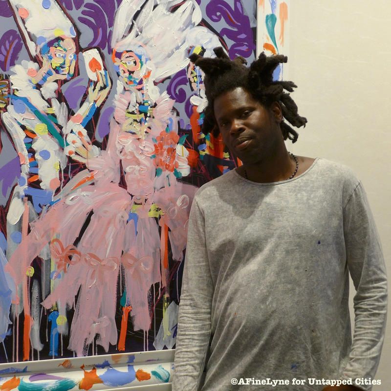 Artist Bradley Theodore standing with his painting, which graces the wall on the lower level of 261 Hudson in SoHo