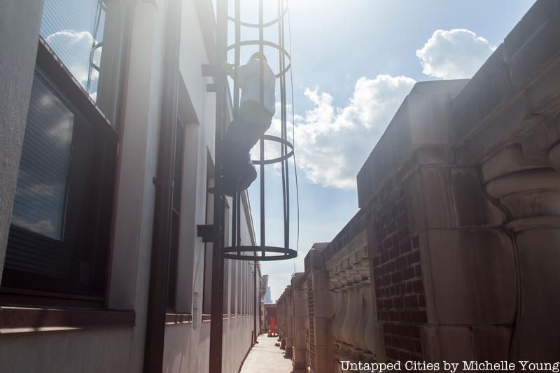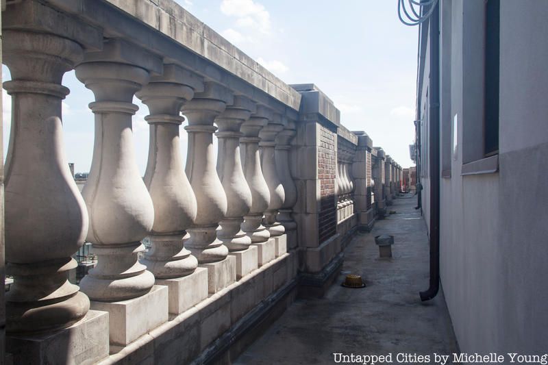 The roof level is used just for maintenance. The whole floor has security cameras, so don’t even attempt a visit up here on your own. Even the folks who work on the 21st floor don’t have access out to the balcony, let alone the roof. To get there, we opened a locked door onto the brick and balustrade balcony: