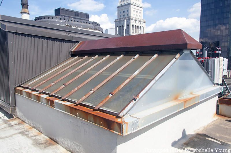 The roof is mostly filled with mechanical equipment and cables. There is a skylight on the roof letting light down to the floor below, one of a series of many other skylights that used to exist