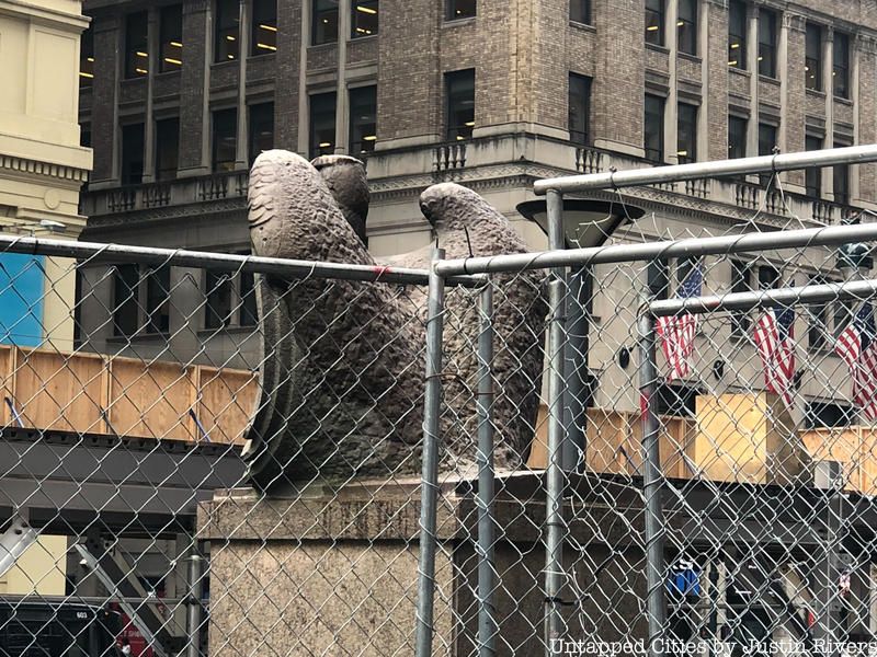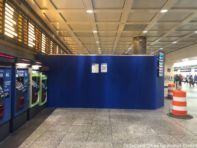 That cast-iron partition in the waiting room of the Long Island Railroad will remain and be integrated with the reconstructed waiting area, much as it is now, Donovan also tells us. There is also work on-going around the ticket machines and ticket windows, including the closure of some ticket windows, a removal of the main departure board, and the relocation of ticket machines. It has been reported that the bar Tracks will close as well. The two eagles along 7th Avenue actually belong to Vornado, so we have reached out to the developer to get an update.