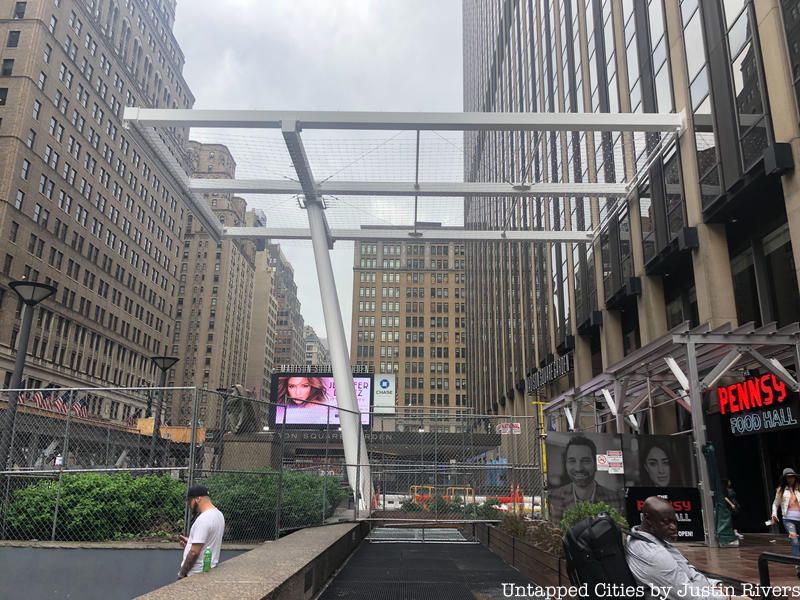 In the area formerly activated by Plaza33, which has seen the temporary installation of Keith Haring and Roy Lichtenstein sculptures and various food and entertainment spaces over the years, will be a dramatic new modern entrance providing access into the Long Island Railroad main concourse and New York City subway, which also recently received a new entrance below ground to the 1/2/3 lines. This project, known as the “East End Gateway,” will add a second direct entrance to LIRR Main Concourse (the 34th Street entrance is the only direct way to get to the concourse currently without going through other jurisdictions of Penn Station, be it NJ Transit, Amtrak, or the NYC Subway). The new entrance will have three escalators, a stairway and an elevator. In addition, what we see under construction at the moment is a cantilevered overhang that will come off of the 7th Avenue facade of Madison Square Garden.