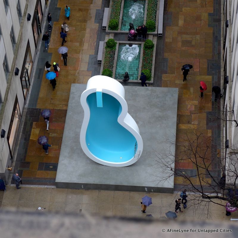 New York has seen its fair share of swimming pools, from dumpsters during Summer Streets to floating ones in the East River, Many are scattered throughout our parks and private buildings in all of five boroughs. But the sight of an upright swimming pool in the Channel Garden is sure to delight all.