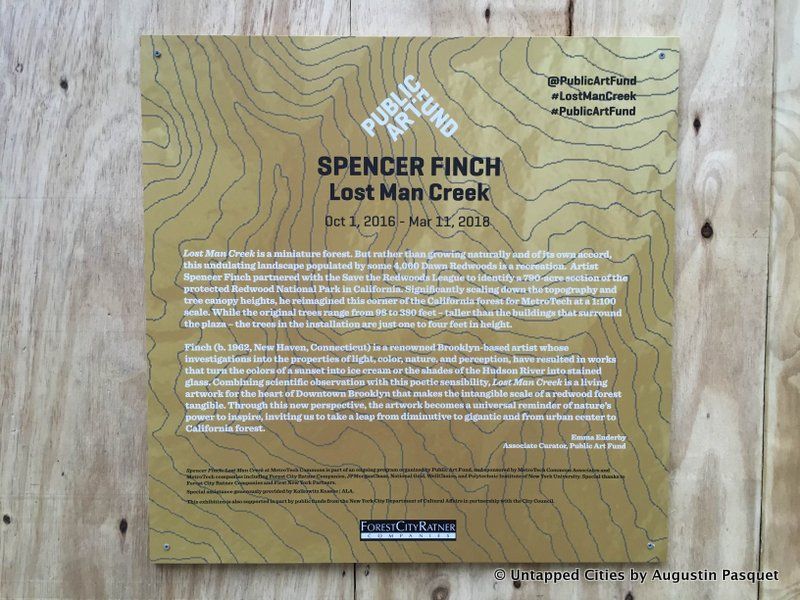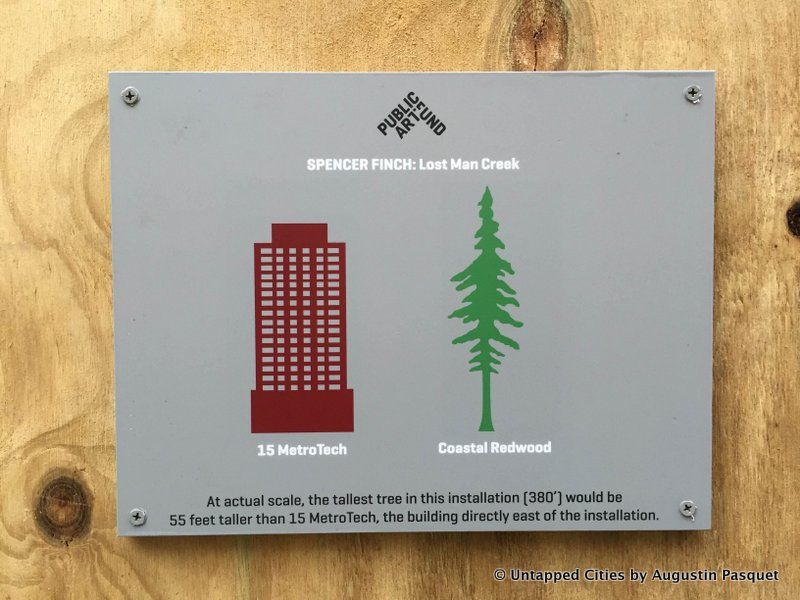 Until this weekend, Spencer Finch was most well-known in New York City for having the longest running art installation on the High Line – The River That Flows Both Ways. Located in a passageway above Chelsea Market, the work was so appropriate to the site with its colored panes of glass, many assumed it was a permanent piece. In contrast, his latest work for Public Art Fund, “Lost Man’s Creek” in Downtown Brooklyn at Metrotech Commons is quite the opposite – a miniature redwood forest at 1:100 scale.