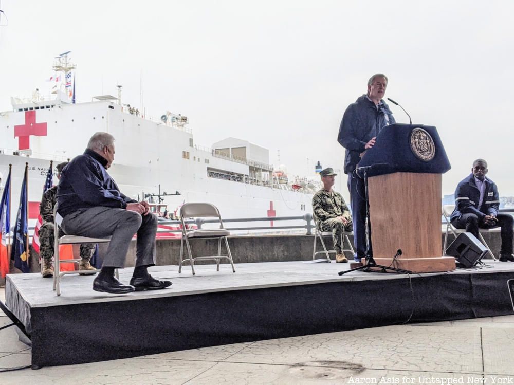 A little spring of hope arrived just now to the New York City harbor as the city battles coronavirus. The USNS Comfort naval ship has docked at Pier 90 on the Hudson River near the Intrepid, and a press conference has begun as we type this. New Yorkers gathered (some at good social distance, others less so) and cheered on the arrival, along with cheers for NYPD boats and other officials. Our photographer Aaron Asis was on hand today to witness the boat’s arrival and to attend the press conference where Governor Andrew M. Cuomo and New York City Mayor Bill de Blasio spoke.