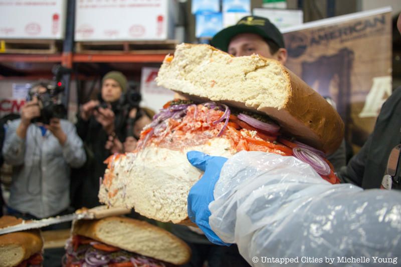 At noon today, Acme Smoked Fish and Zucker’s Bagels began creating the world’s largest bagel and lox sandwich at the Acme headquarters at 30 Gem Street in Greenpoint, Brooklyn. We were on site, with a large, excited crowd, to witness the event. The mood was festive, with live music and booming commentator provided by Richie Schiff, the Vice President of Sales for Acme. The bagel ended up clocking in at exactly 213.75 pounds. You can see the step by step creation in photographs below!