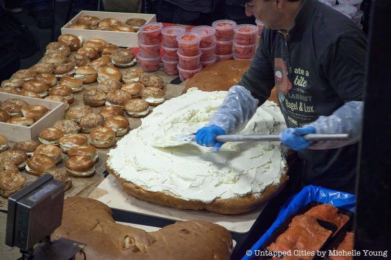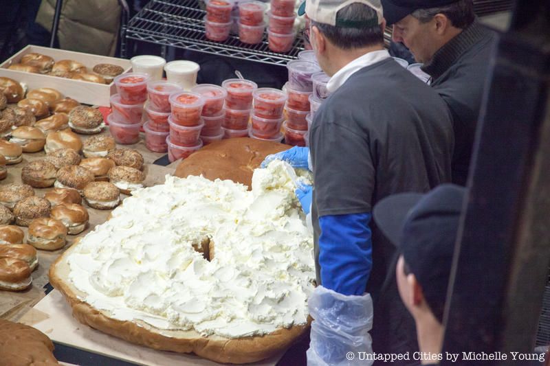 Things began with shmearing large dollops of cream cheese, about 40 pounds worth, onto the bottom side of the bagel. Acme co-CEO Adam Caslow and Zucker’s Bagels shop founder Matt Pomerantz were at work, along with other helpers.