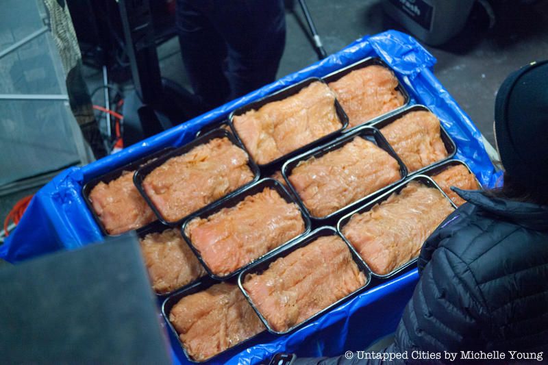 Then 45 pounds of Acme’s Nova Scotia Smoked Salmon were rolled in on a cart and placed in a mini mountain atop the cream cheese. About 30 pounds were used.