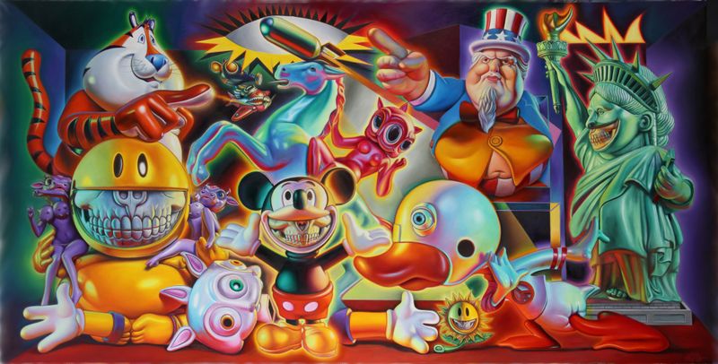 The Allouche Gallery in the Meatpacking District, opened its doors this week to its first solo show – a timely and stunning exhibit of new work by artist Ron English entitled Ron English: Guernica. The eighteen paintings are English’s narrative to Pablo Picasso’s 1937 painting Guernica, which was Picasso’s immediate artistic reaction to the Nazi’s bombing practices on the Basque town of Guernica during the Spanish Civil War. The wide, mural-size Guernica of the 1930s reflects the suffering on civilians in its political message. English, taking a three-year, deep dive into the creation of this body of work, has brought Guernica into the twenty-first century, forcing the viewer to face cultural biases, embedded in our consciousness, the complexities of waste, destruction, horror and conquest.
