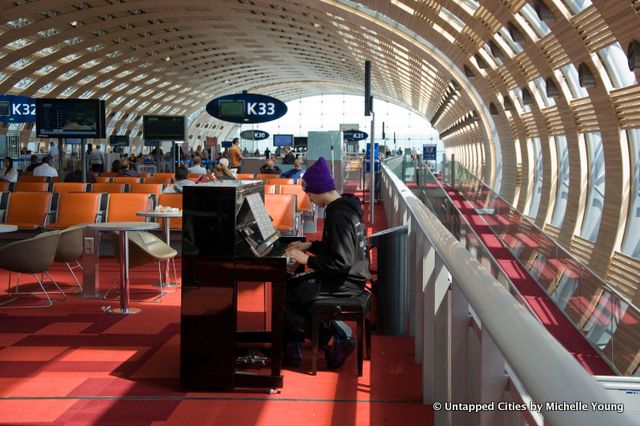 This year’s pop-up piano festival in Paris, Play Me I’m Yours, just concluded on July 9th, but there’s one piano still surprising visitors daily. In the beautiful Terminal 2E at Charles de Gaulle Airport sits an impromptu piano, unpainted like the Play Me I’m Yours pianos, but still a welcome respite for weary travelers. It’s not part of the official festival, but someone has clearly taken the cue.