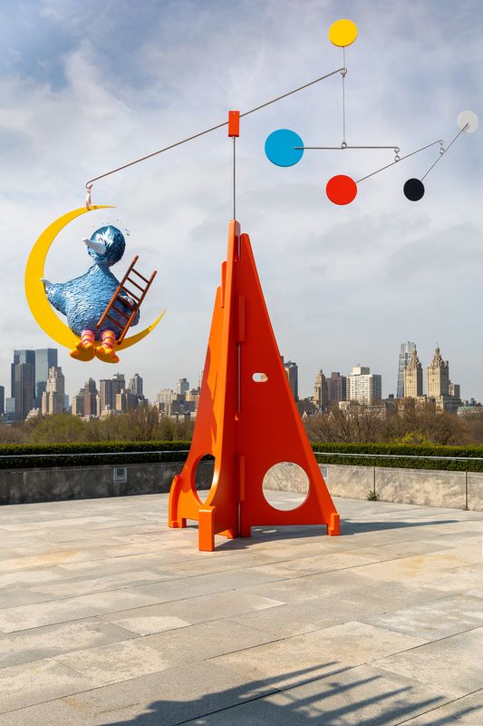 Now, with its release to the public, we can see that Da Corte’s design is a modern standing mobile whose base is constructed with three striking interlocking orange pieces. Atop the base is the mobile component, adorned by a blue Big Bird sitting on a crescent moon overlooking New York City. Blue, yellow, red, black, and white circles hang opposite Big Bird’s perch.