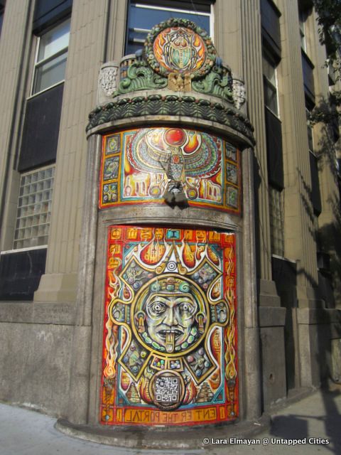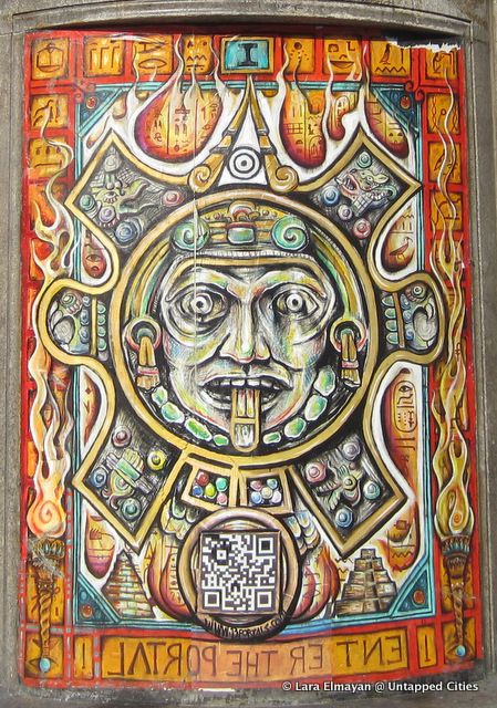 If you’ve wandered Alphabet City lately, you might have noticed the artwork pictured above, or others like it. This hand-painted mural on the corner of Avenue C and 7th Street, the first portal in series of an eventual 13, looks like something out of a Meso-American temple, but invites invites viewers to “enter the portal” by scanning a QR Code with their smartphone.