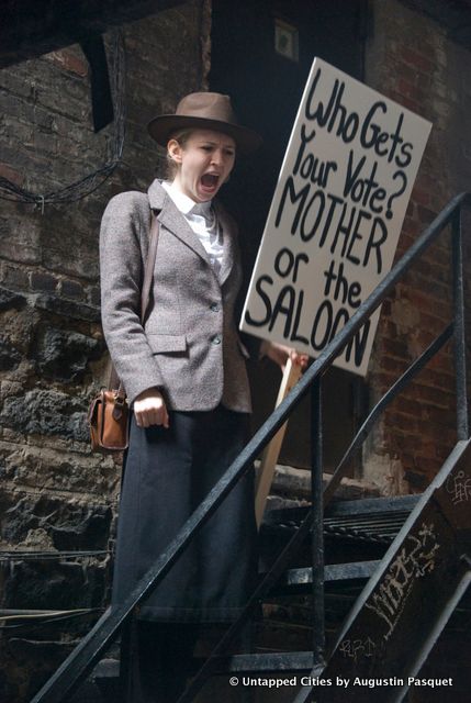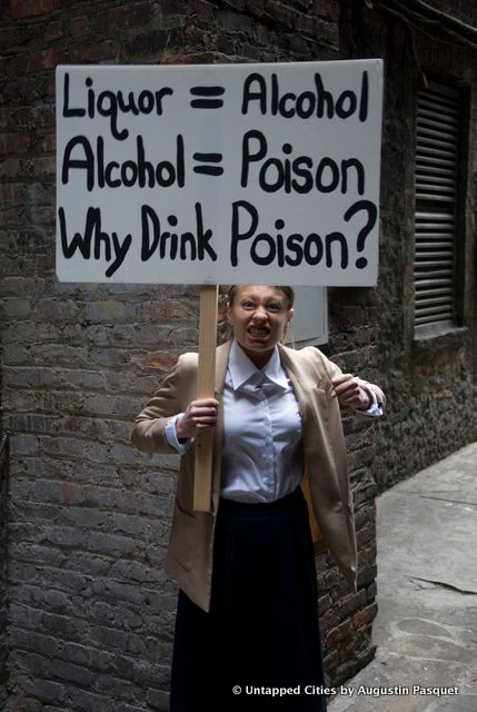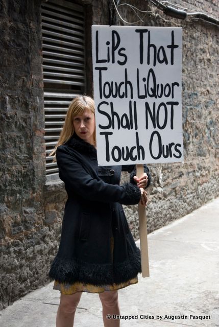 Two days before the event, the chefs gave guests only a street intersection in the Lower East Side and when attendees arrived, flappers ushered them down the alleyway of the Back Room, whereupon they were summarily confronted by the angry women’s temperance movement picketing with signs that read, “Lips that touch liquor shall not touch ours,” “Alcohol = poison,” and “You are the public enemy.”