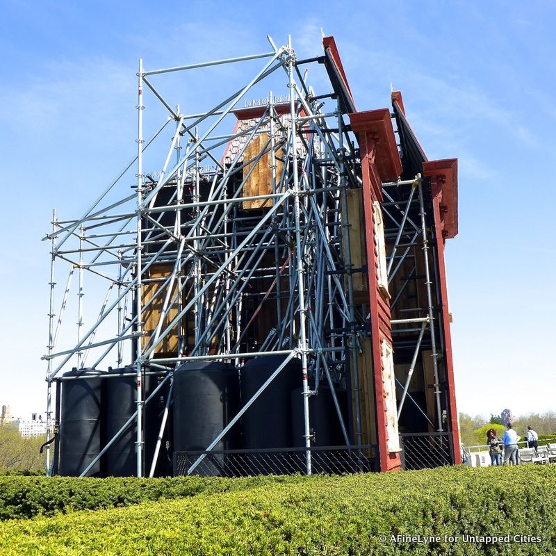 It isn’t until you walk around the back of the thirty-foot tall house that you realize it is just a facade, placed at the same angle as the Psycho House in the film. Scaffolding must be able to withstand 100 mile per hour winds, and the black tanks are filled with water to act as ballast. You can even see PsychoBarn from Central Park. When you are looking up toward the roof garden, The Metropolitan Museum of Art becomes the hill on which the Psycho house sat in the film.