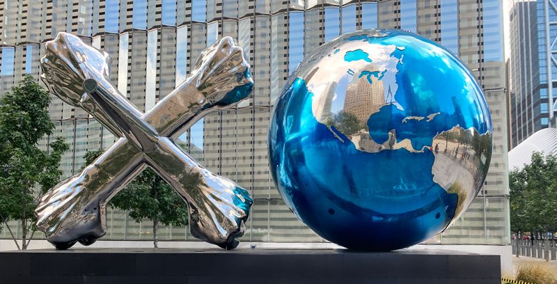 XO World Project consists of two monumental sculptures at the World Trade Center Campus. Designed by artist Daniel Anderson, XO World and XO Play promote messages of inclusivity, hope, and positivity among their viewers. Both sculptures were inspired by the widely played game Jacks. The “X” of XO World is represented by a Jack with crossed arms attached to the spoke — simultaneously being a reference to the word “love” in sign language. On the other hand, the “O” is represented by a globe.