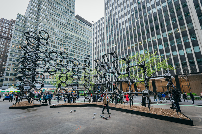 Artist Chakaia Booker has been transforming found materials into art since the 1980s. In her latest work, on view now in the Garment District, she used salvaged rubber tires to create a 35-foot-tall abstract sculpture. Located on the Broadway plazas between 39th and 40th Streets, the sculpture is titled Shaved Portions. Booker created this piece by slicing, twisting, and weaving tire remnants into new forms. The characteristics of the tires, from their wear and tear to their tread patterns, and the way Booker weaves them together, represent various aspects of human life, such as African textile design, human diversity, and our own physical marks of aging. The sculpture will be on view through November 1st. Viewers are encouraged to share their experiences with the work on social media by following and tagging @GarmentDistrictNYC on Instagram, and Facebook, @GarmentDstrctNY on X, and @Garment_District on TikTok.