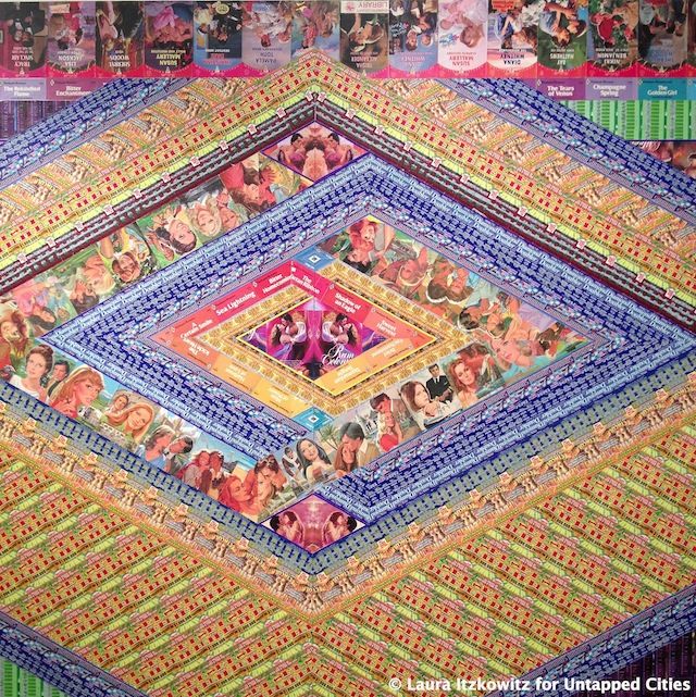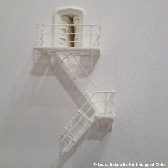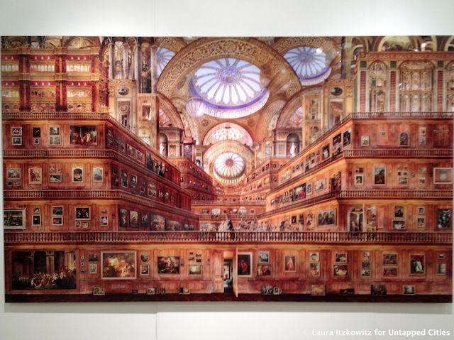 Hyper-photo by French artist Jean François Rauzier, represented by London-based gallery Waterhouse & Dodd. I first saw Rauzier’s hyper-photos at SCOPE, where he exhibited an amazing image from Pantin, the graffiti mecca outside Paris. This image is a composite of the Blue Mosque in Istanbul, the Library of Congress, paintings from various museums and other elements.I couldn’t help admiring this collage by artist duo Ghost of a Dream, whom we interviewed in connection with their work in No Longer Empty’s ‘How Much Do I Owe You?’ exhibition. Ghost of a Dream uses found materials like lottery tickets and the covers of romance novels to explore people’s dreams and fantasies. This collage is showing at Davidson Contemporary‘s booth.Upstairs, in the Impulse section, Montreal-based gallery Art Mûr is showing a collection of little architectural sculptures by Guillaume Lachapelle. Lachapelle first draws models and then creates them using a 3D printer. They seem to question the limits of space, by showing bookcases that curve inwards and disappear into a mysterious abyss, or else by presenting a house that seems to be floating in the air, supported only by thin pipes. They remind me a bit of Daniel Arsham‘s sculptures, which seem to defy the laws of physics.
