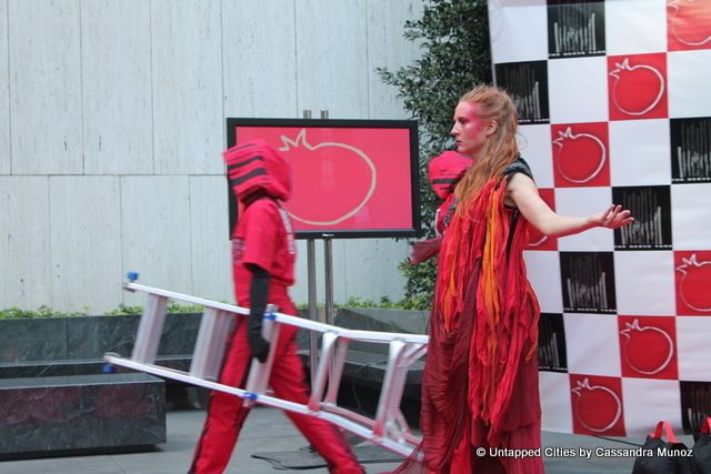 Glory Road features Persephone, clad in red, haltingly moving about the stage (or red carpet) as Sisyphus rolls a metal sphere from one side to the other. Hooded guards stand watch as Persephone’s voice speaks directions from speakers in the “boulder” to viewers in Grace Plaza. In the background televisions are playing footage of Persephone: her face comes in to focus, the camera zooms in, an eye blinks, every so often there is a cascade of rose-colored skirts. After about 20 minutes, Sisyphus snags up a microphone and begins to sing a song that includes the very appropriate lyrics “woke up this morning between a rock and a hard place.” Those walking by stop and gape.