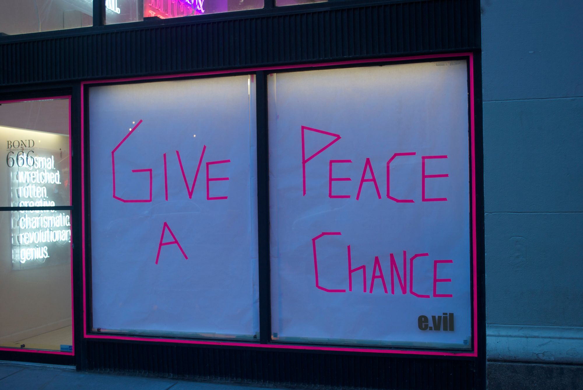Reminds me of my days as a fashion merchandiser for Abercrombie & Fitch. I came up with the t-shirt “One Duff is Enough” so if you bought that shirt and thought it was hilarious, you can thank me. I was referring to Hayley Duff (sister to Hilary), for those of you who don’t follow teen-pop culture. But back to e.vil, the installation claiming people like James Franco, Lil Wayne and Terry Richardson were “e.vil” only lasted a few days, replaced by the more P.C. “Give Peace a Chance.”