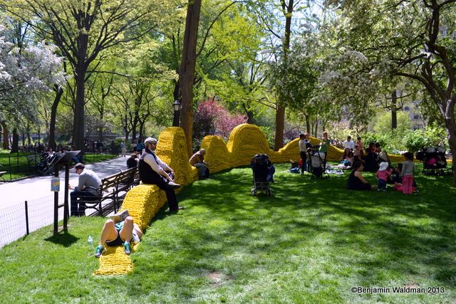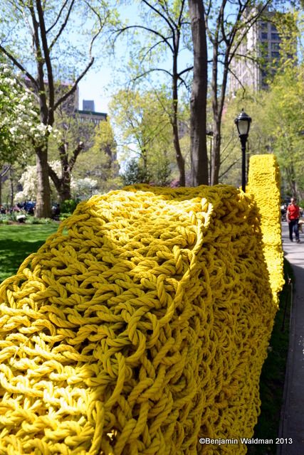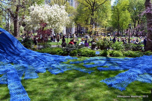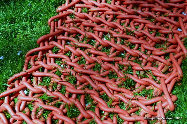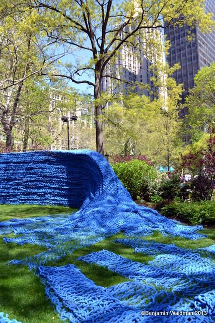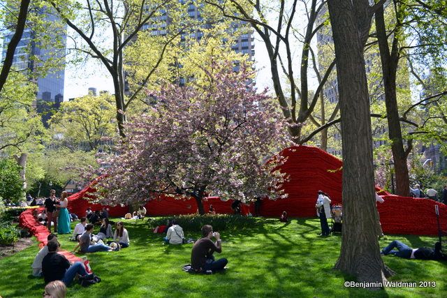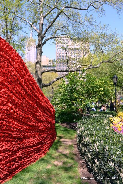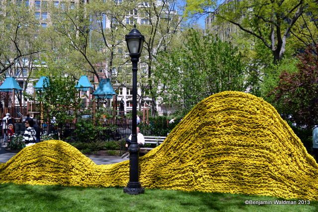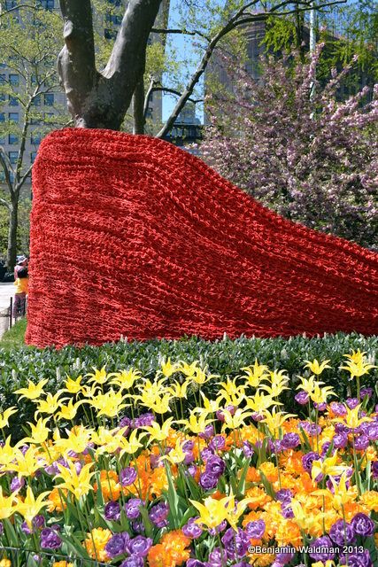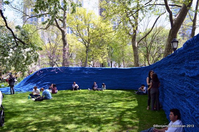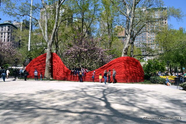 From May 2, through September 8, Orly Genger‘s monumental Red, Yellow and Blue, will be exhibited in Madison Square Park. Intricately hand-knotted nautical ropes covered in paint brighten the landscape of the park. Genger created an interactive work that appears to rise out of the ground and then flow seamlessly back into it. The work consists of 1.4 million feet of rope—the total length equating to nearly 20 times the length of Manhattan—covered in over 3,000 gallons of paint, and weighing over an astounding 100,000 pounds.