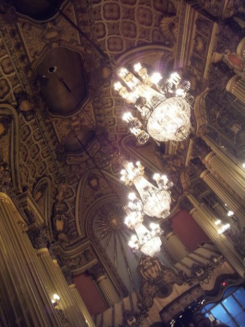 This illusion followed us through the doors of the Los Angeles Theatre. Inside the main lobby, our eyes were instinctively drawn 50 feet upward towards tiered crystal chandeliers casting alluring lights and shadows on the elaborately painted ceiling, like something you would expect in a royal palace.