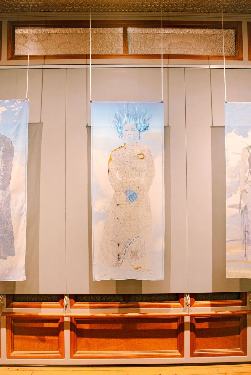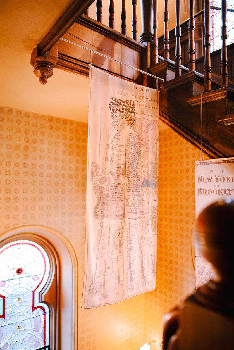 For example, while creating the portrait of journalist Zoe Anderson Norris, Ottenberg used a map that “listed public buildings, places of recreation, churches, and hotels–a map that she could have used, and would have suited her style of targeted undercover investigative reporting.” The portraits of these women appear almost ghost-like, printed on gossamer silk or cotton banners hung in seven different locations throughout the Museum’s gallery and historic sanctuary.
