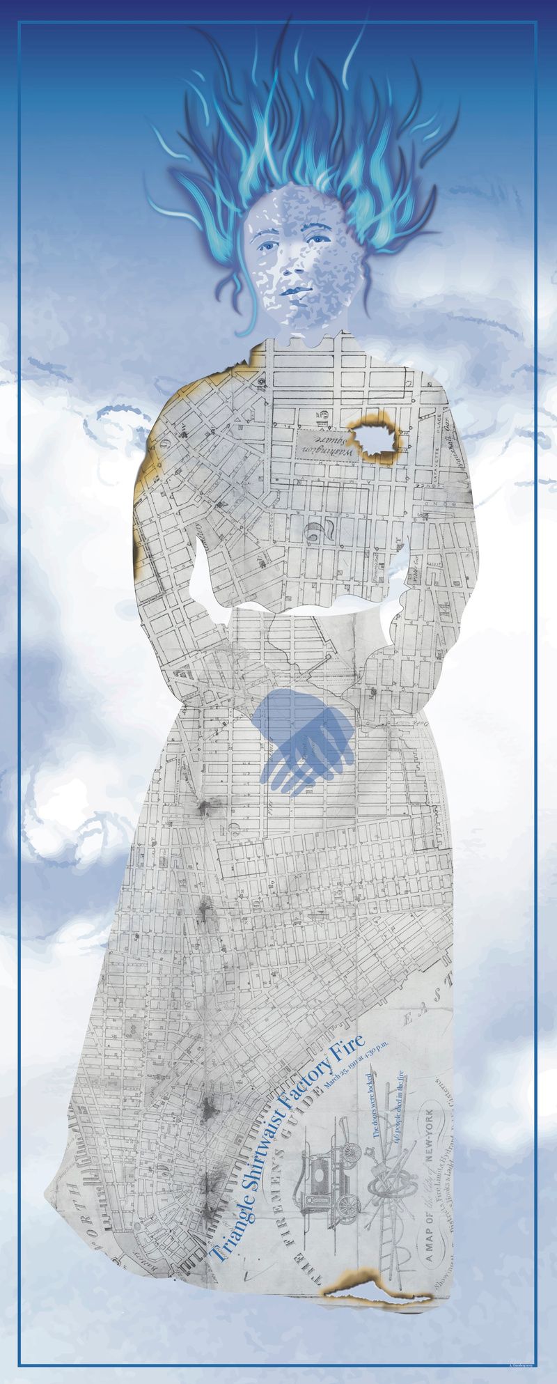 Each portrait featured is superimposed with maps and architectural details of the Lower East Side neighborhood. Ottenberg, who combines traditional drawing and painting with digital media in her work, earned an MA in geography at CUNY to learn more about computer mapping. For this installation, “the maps I used were mostly from the early 1900s– insurance maps, a fireman’s map, manufacturing maps, a transportation map, and tourist and housing maps,” says Ottenberg, “I wanted the women to have maps that related to some aspect of their lives or experiences of the neighborhood.”