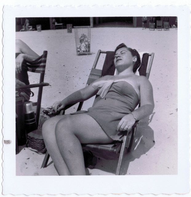 My grandmother Roslyn getting some sun on the beach at Coney Island, mid 1950s.