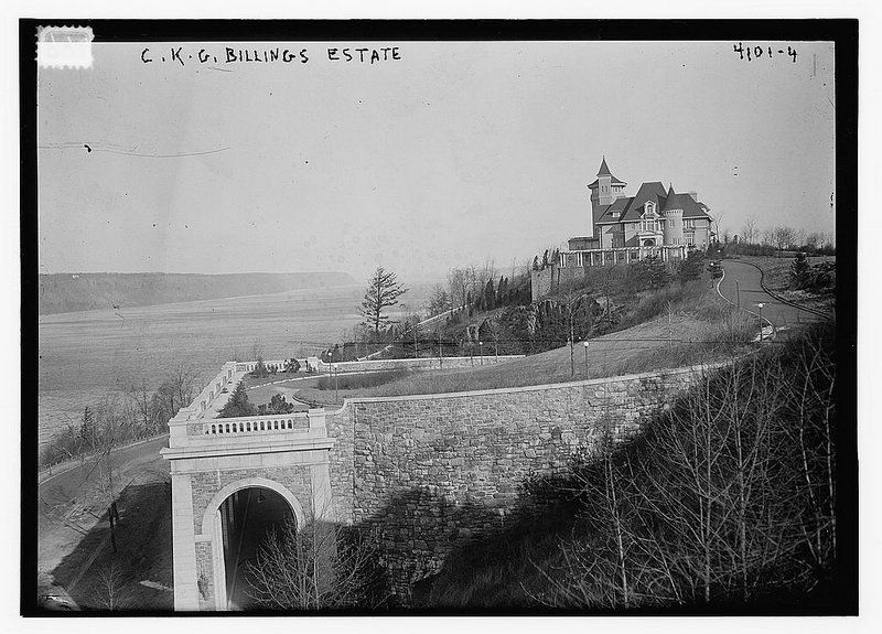 C.K.G Billings, the retired president of the People’s Gas Company of Chicago, started construction on his Manhattan estate in 1901. The incredible natural vistas of Fort Washington and his love for horse racing drew him to northern Manhattan, where he could be close to the Harlem River Speedway that once operated on Harlem River Drive. The New York Times reported that Billings’ estate, which was to feature a large mansion, stables for sixty horses, and an observatory from which to observe the panoramic views of the waterfront location, would “rival anything of its kind in the city.”