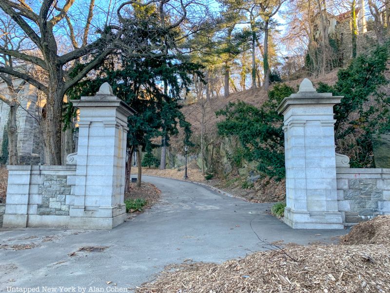 When Fort Tryon Park was created in the 1930s, the road beneath the bridge was turned into a pedestrian path and the driveway above was made into a lookout point. The Billings Terrace and Arcade are easily spotted from the Henry Hudson Parkway and can also be seen from above on Cabrini Blvd. You can walk down from the Billings Lawn and Terrace to access the Arcade. Underneath the arches, you can still see the beveled bricks the drive was paved with. These special red bricks made it easier for horses to navigate and helped prevent their hooves from slipping. Stone pillars at the end of the driveway mark the former location of a gate that led to Riverside Drive.