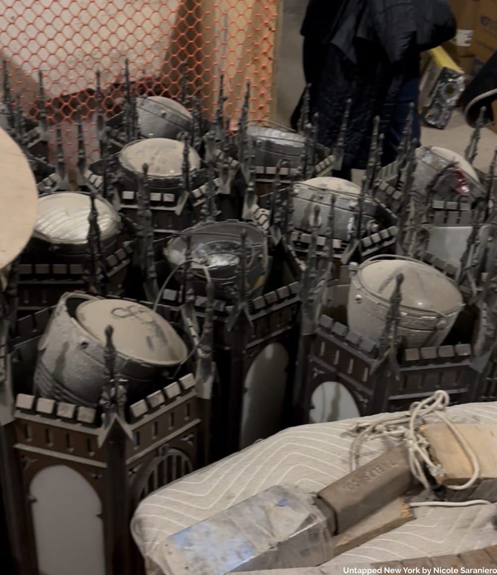 On a recent tour of the crypt with Untapped New York Insiders, we learned that the lampposts and bases have made it out of the crypt and are on their way to Moynihan Train Hall, while the Cathedral still has the Gothic lanterns down in the crypt.