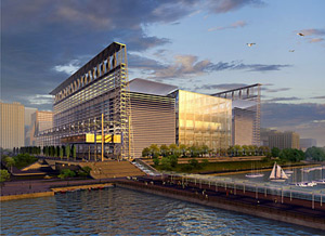 Thom Mayne of Morphosis Architects designed the sprawling campus of New York’s Olympic Village for a site in Long Island City. The village would have provided 4500 part-time housing units for 16000 athletes and coaches. Inspired by Le Corbusier’s “Towers in the Park” design, 42 acres of urban park space would surround the village.
