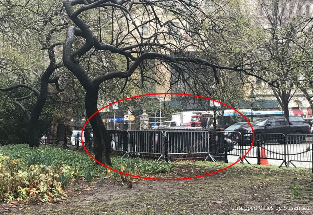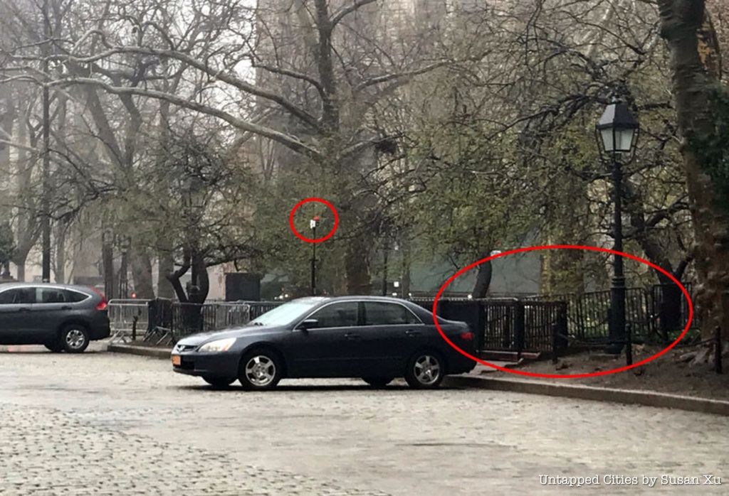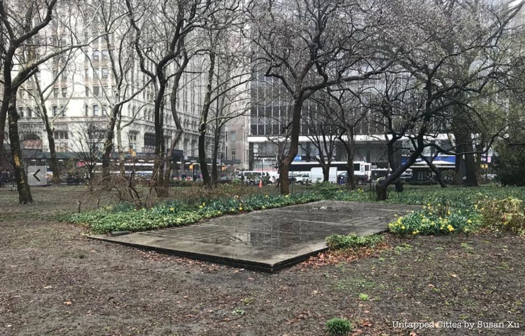 In the same area, there are also three embankments of glass blocks, embedded in the concrete to allow natural light to filter into the station. The easiest one to spot is “on the northern most end of the park between the park fence on Broadway and the chess tables. You can clearly see it,” says Rivers. It’s pictured below: