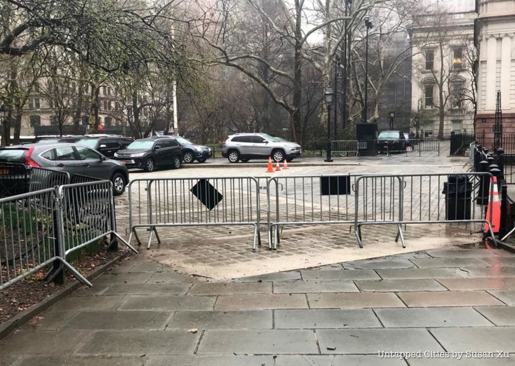 One of the most obvious is the station’s entrance, surrounded by fencing that looks almost like the entrance to a modern station. It’s located on the edge of the restricted parking lot in front of City Hall. As our tour guide Justin Rivers tells us: “The street entrance to City Hall Station is an old IRT entrance now painted completely black. It’s located inside the gated grounds of City Hall by the Broadway gate directly across from the newsstand on Broadway by the W, R City Hall stop.” According to subwaynut.com, the entrance once had normal, modern green subway globes installed around it, which have since been removed. Today, there’s just a small box with a red emergency light (barely noticeable in the first photo below).