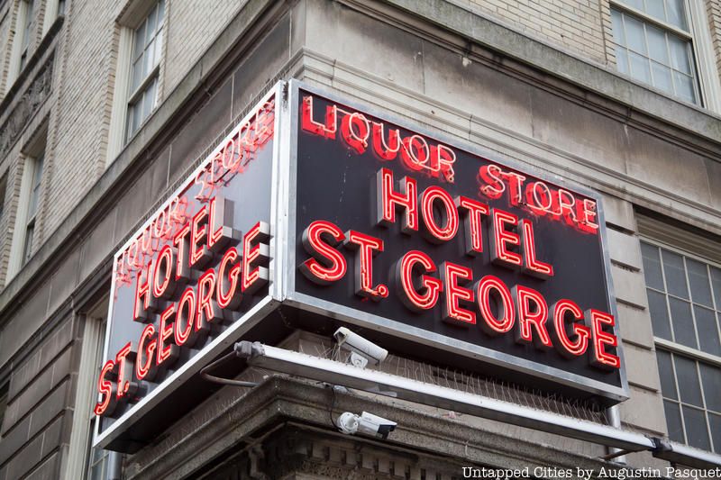 On the corner of the building at the intersection of Clark Street and Henry Street is a neon sign, for “LIQUOR STORE HOTEL ST. GEORGE.” The wine shop below it, “Michael-Towne Wine & Spirits” was first opened in 1934, and as the Town Wine & Spirits (before the merger with Michael Wines in Brooklyn Heights) was the 65th store to obtain a license to operate in New York State following the repeal of Prohibition. Today the red neon sign is somewhat obstructed by the ever-present scaffolding.