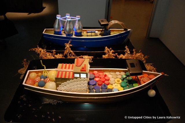 Working with the Newtown Creek Armada, the Hudson River Foundation, the North Brooklyn Boat Club, and the cultural affairs department of Two Trees, the artists set out to explore Newtown Creek’s ecological past and present in a project entitled “Remote Voyages”. They created the mini-boats using the creek’s flotsam, like plastic bottle caps, scrap metal and reeds. The decorative elements on the boat in the background represent the digester eggs. The boat with the oysters hanging off the sides represents the use of oyster beds as a way to clean up the creek. At the opening, Kensinger explained that this area used to be full of oyster beds, though today you certainly couldn’t consume anything that came out of the creek.
