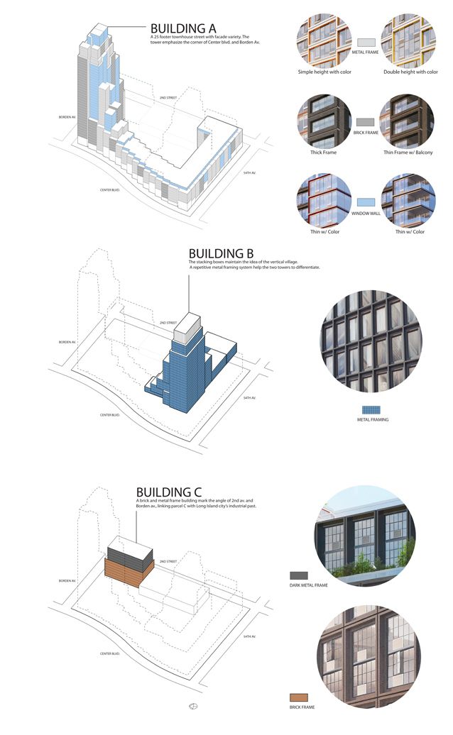 Part of the Hunter’s Point South design guidelines was to differentiate building parts so it looks like the neighborhood was built over time. The renderings by ODA below give you an idea of the differentiation in the tower designs and the variation in materials: