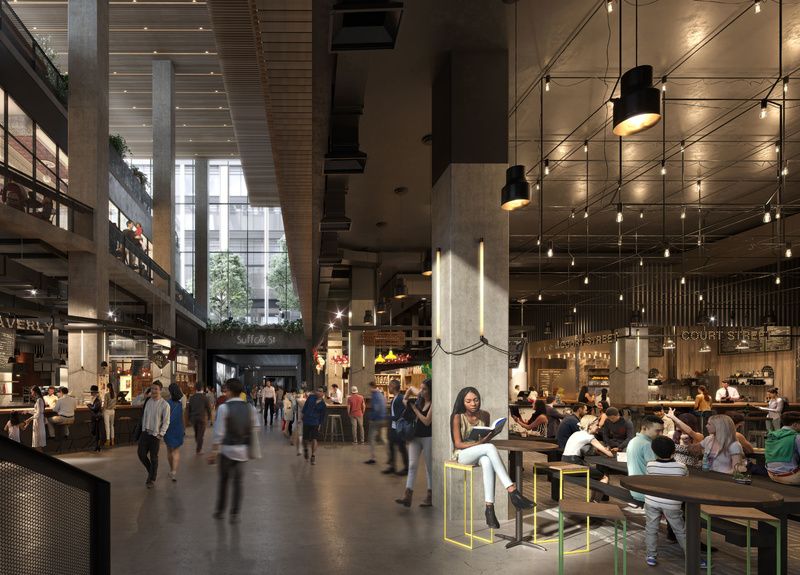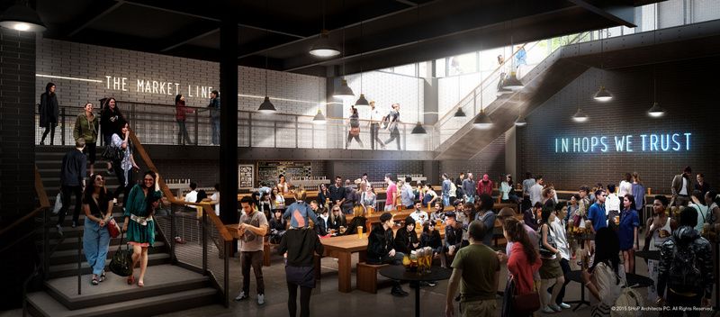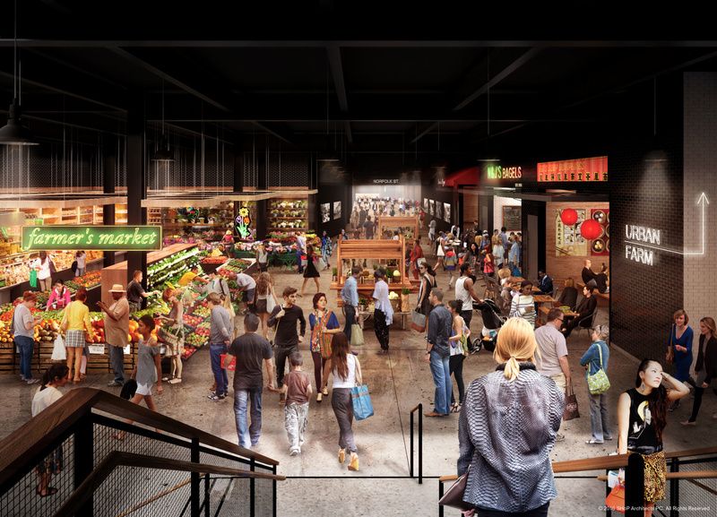 We’ve been keeping tabs on the progress of the Lower East Side’s Essex Crossing for some time now. When completed, the 1.9 million-square-foot, mixed-use project — spanning roughly between Stanton and Grand Streets to the north and south, and Essex and Clinton Streets to the west and east — will be home to new housing units, office space and retail shops. Although the wait has been long, we’re now getting another look at one of the most anticipated aspects of the mega-development: The Market Line, the 150,000-square-foot, subterranean market that will anchor three buildings. Check out the latest renderings of the forthcoming marketplace, what will be New York City’s largest, below: