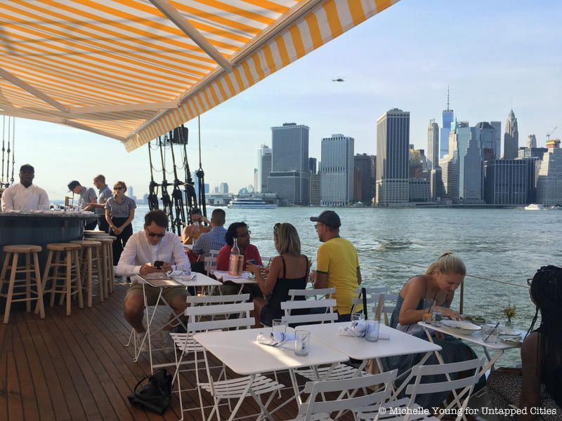 Pilot, docked on the north side of Brooklyn Bridge Park’s Pier 6, is a sister restaurant to Grand Banks (you can tell by their matching yellow and white striped awnings). This restaurant sits aboard another historic and rare Grand Banks-style schooner. The ship was originally commissioned as a racing vessel in 1924 and still retains many of its historic elements including the hull, topsides, pilothouse, deck, cabin top, and rigging.
