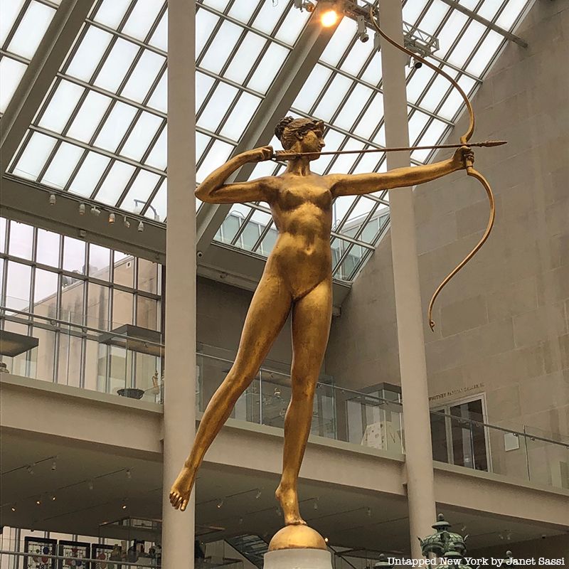 As architectural taste has morphed from concrete effigies in the human likeness to sleek-lined abstract sculpture and angular design, some rooftop statues have found homes in museums. One such sculpture is a 13-foot copper statue of the Roman goddess Diana on tiptoe, drawing her hunting bow. The statue was a rotating weathervane atop the original Pennsylvania Station from 1893 until 1925, when the station was demolished. The original — the only female nude sculpture designed by Augustus Saint-Gaudens — is housed in the Philadelphia Museum of Art.