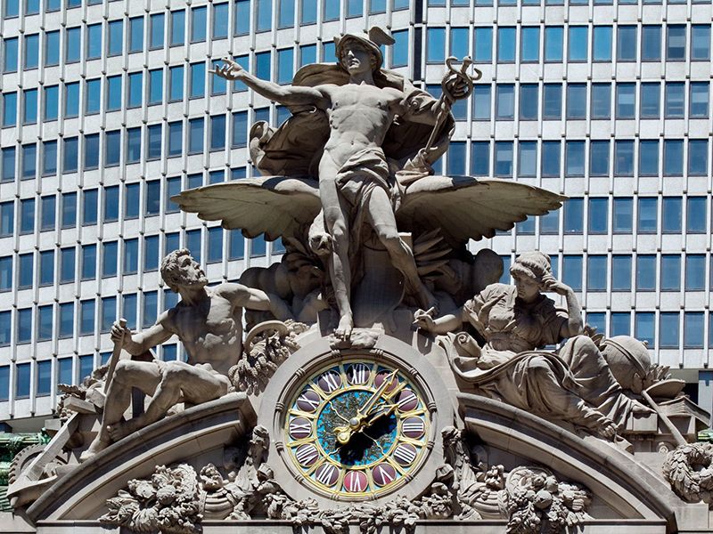 A “real” Hermes statue stands above the 42nd Street façade of Grand Central. The wing-hatted, semi-nude messenger god is flanked on its lower sides by the god Hercules and the goddess Minerva. French sculptor Jules Félix-Coutan, then president of the Académie des Beaux-Arts, designed the sandstone triad. He constructed the statues on the finished building in 1914 more than a year after the station was completed. At the time, it was the largest ‘sculptural group’ in the world.